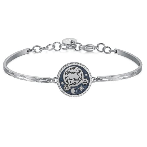 Bracciale semirigido in acciaio 316L con segno zodiacale PESCI, smalto blu glitterato e cristallo Swarovski®crystal.