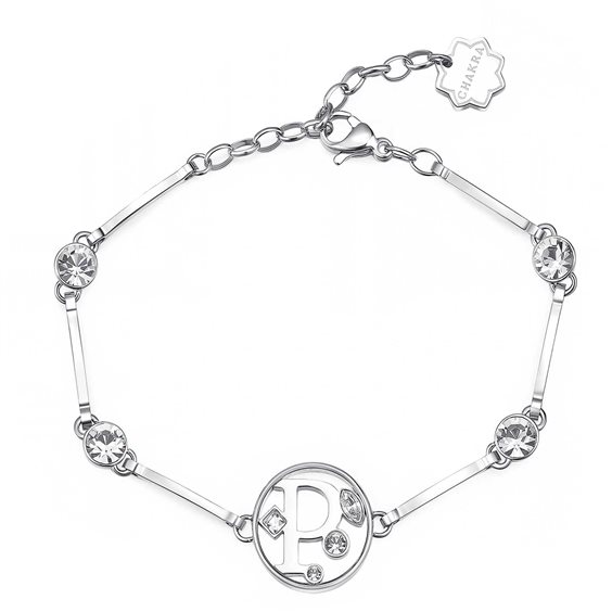 Bracciale Da Donna Di Brosway Della Collezione Chakra. Bracciale Realizzato In Acciaio Con Cristalli. Dettaglio: Lettera P, Significato: Discrezione, Indipendenza, Sensibilità. Lunghezza: 185 Mm. La Referenza È Bhkb064