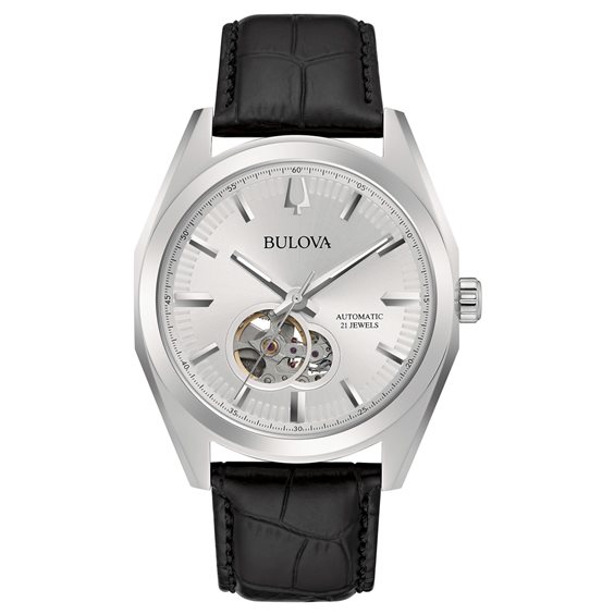 Orologio automatico della collezione Bulova Surveyor da uomo. Colore cassa: argento; colore del quadrante: argento; colore del cinturino: nero. Cassa di diametro 42 mm in acciaio inossidabile 316L con fondello a vite con oblò trasparente e movimento a vista. Vetro minerale. Cinturino in pelle nera con chiusura ad ardiglione. Movimento meccanico automatico, 21 rubini e 42 ore di riserva di carica. Classificazione di impermeabilità (WR) 3 ATM: resistente agli schizzi d’acqua ed alla pioggia, ma non sotto pressione.