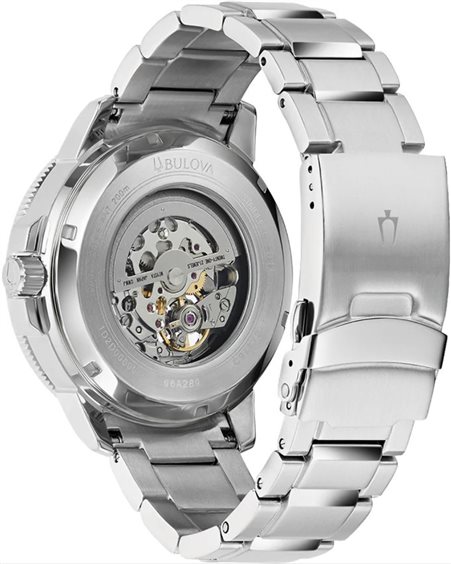 Orologio uomo solo tempo modello Marine Star Automatic. Cassa in acciaio satinato e lucido con paracolpi per la corona a vite, ghiera girevole unidirezionale nera, fondello serrato a vite vista movimento. Movimento automatico scheletrato 21 rubini con riserva di carica 40 ore. Vetro minerale piano. Quadrante nero trasparente sulla parte centrale con oblò vista movimento ad ore 6/7, indici e lancette lucide e luminescenti. Bracciale regolabile in acciaio lucido e satinato, chiusura deployante con pulsanti. Impermeabile 20 Bar (Atm). Scatola libretto istruzioni e garanzia 2+1 anni originali.
