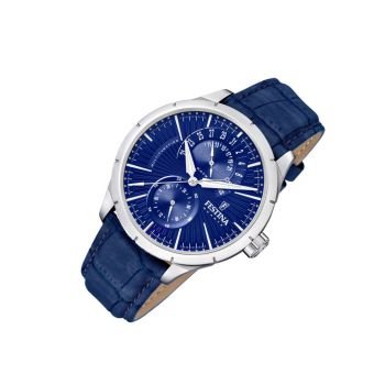 Orologio multifunzione al quarzo, water resistant 50 mt, cassa e fondello in acciaio 316L, cinturino in ecopelle blu con stampa coccodrillo.