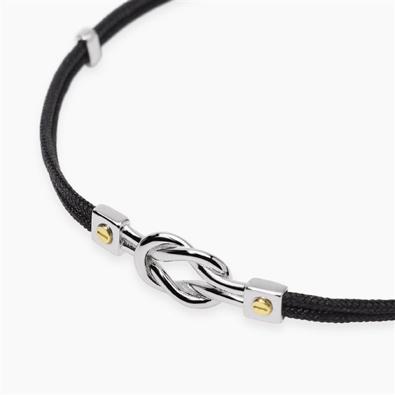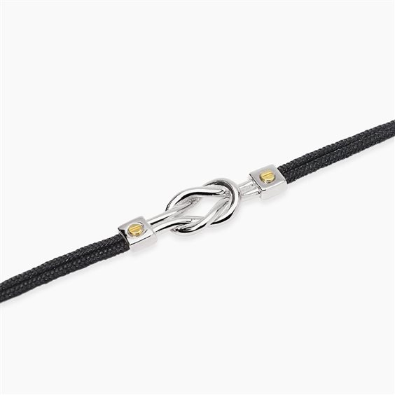 Bracciale in cordoncino nero e argento 925. "Nodo" centrale cm 2,3, inserti placcati oro giallo 18Kt. Chiusura a moschettone. Misura regolabile da cm 18,5 a cm 20,5.