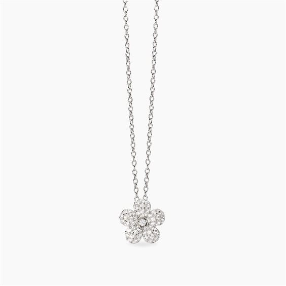 Girocollo in argento con fiore in zirconi Girocollo in argento con catena forzatina diamantata e ciondolo fiore in zirconi. • Dimensione catena: 1,2 mm • Dimensione fiore: 11,4x11 mm • Diametro zirconi: 1 e 2 mm • Misura regolabile dalla 39 alla 43 cm • Materiale: Argento rodiato 925, Zirconi
