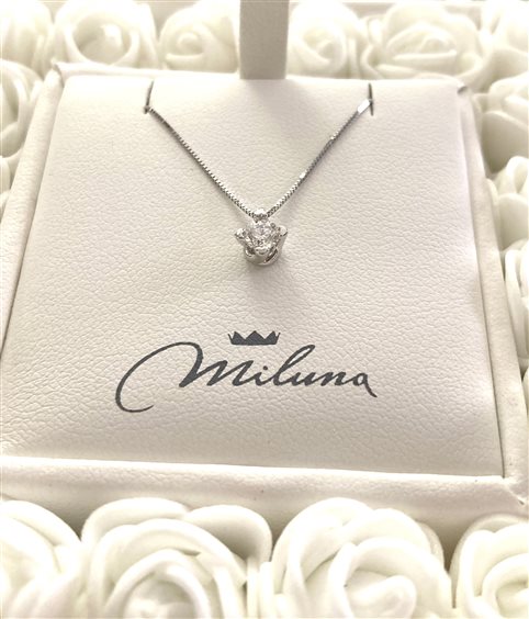 Collana punto luce in oro bianco con catena veneziana con due anellini finali per poter regolare la lunghezza. Castone a 4 graffe a cuoricino che reggono un diamante taglio brillante da 0.20 punti di carato.