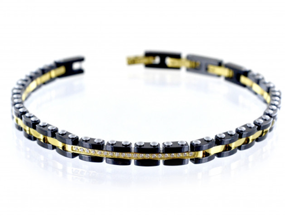 bracciale della collezione zancan da uomo. il gioiello è in acciaio inossidabile ipoallergenico 316l composto da maglie bicolore in pvd giallo e nero, e da targa centrale impreziosita da zirconi bianchi. lunghezza 21.50 cm