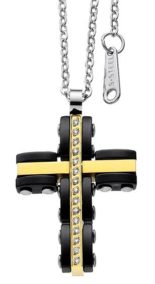 COLLANA IN ACCIAIO 316L - CROCE PENDENTE IN PVD COL ORO GIALLO E LATERALI NERI